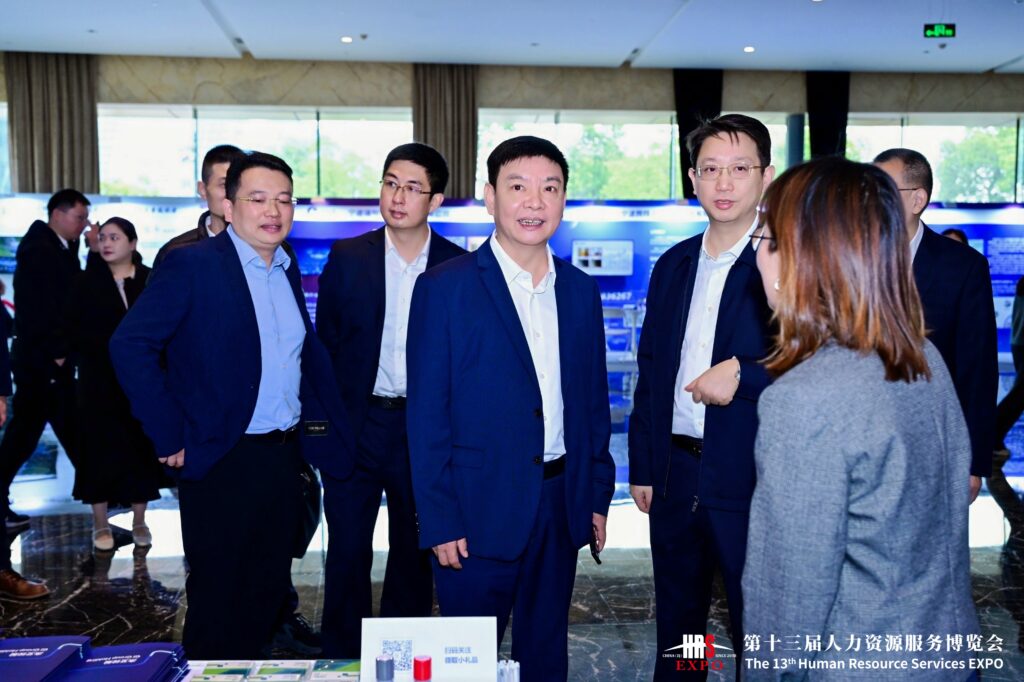 展会期间,浙江省人力资源和社会保障厅党组副书记、副厅长张旭明,省人力资源服务协会会长袁中伟,宁波市人社局人力社保局副局长、党组副书记徐承志等领导巡视杰艾展位。杰艾控股集团代表孙晓雯女士在展会现场热情接待并与其介绍公司及业务状况、进行了交流与探讨。