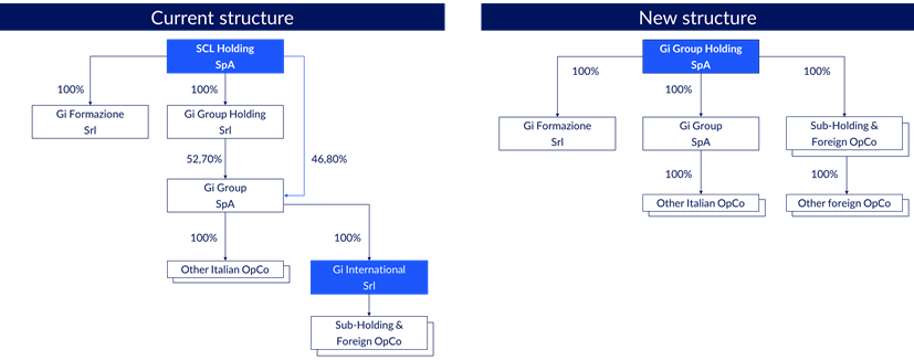 L’evoluzione e la continua crescita a livello globale ha spinto il management ad avviare un percorso di rinnovamento. In particolare, il nuovo assetto punta a semplificare i livelli gerarchici e la governance concentrando il controllo sotto un’unica holding, GI GROUP HOLDING S.p.A., dotata delle risorse idonee a coordinare l’attività delle controllate italiane ed estere. L’obiettivo è quello di massimizzare il valore complessivo e le sinergie interne, semplificare i flussi monetari, migliorare la riconoscibilità del Gruppo, favorire la strategia di M&A ed eventuali operazioni sui capital markets.