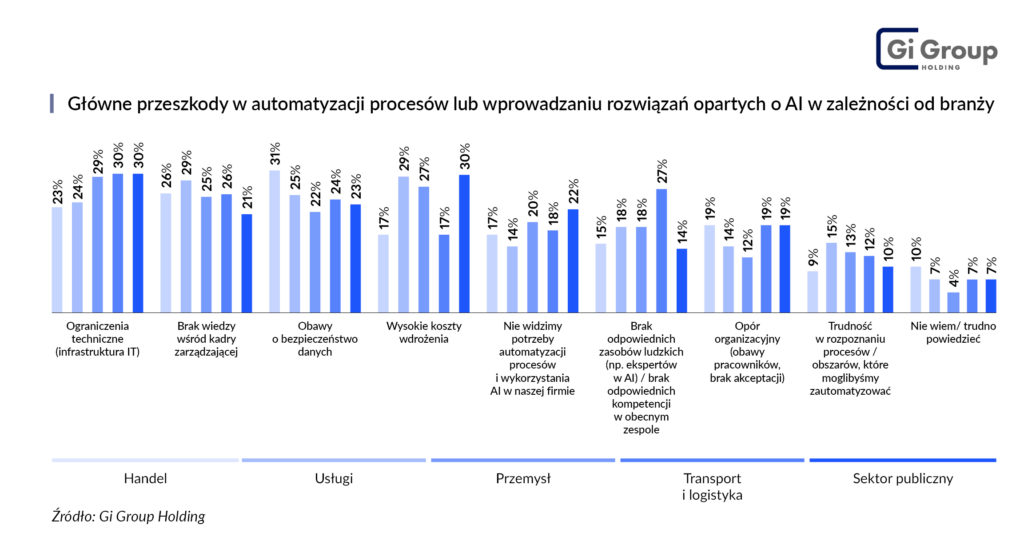 Z kolei jak wynika z „Barometru Rynku Pracy” Gi Group Holding, to ograniczenia techniczne najczęściej hamują rozwój automatyzacji w sektorze transportowo-logistycznym (30% wskazań). Innym istotnym czynnikiem jest deficyt specjalistów oraz kompetencji (27%), przy czym równie ważnym powodem jest brak wiedzy kadry zarządzającej – 26%. W dalszej kolejności firmy wskazują na bezpieczeństwo danych  (24%) oraz opór organizacyjny (19%), oznaczający brak akceptacji i obawy pracowników. Na uwagę zwracają koszty wdrożenia, które wydają się mniejszą przeszkodą w przypadku firm sektora – 17%.