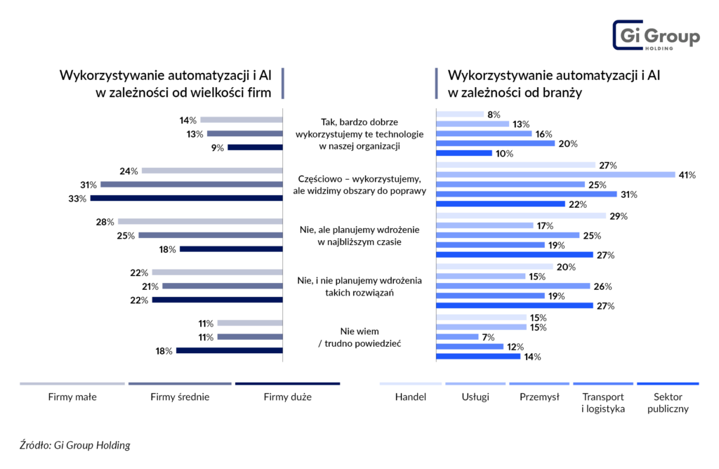 Tymczasem z „Barometru Rynku Pracy” Gi Group Holding wynika, że automatyzację i sztuczną inteligencję wykorzystuje 20% firm branży transportowej i logistycznej, a 31% robi to częściowo. Jednocześnie 19% planuje ich wdrożenie, natomiast 27% nie rozważa podjęcia takich kroków. Różnice w ocenie stopnia zaawansowania wdrożenia tych rozwiązań technologicznych w porównaniu z innymi danymi mogą wynikać z rozumienia automatyzacji i AI – w badaniu Gi Group Holding były one definiowane przez przedstawicieli przedsiębiorstw przede wszystkim jako usprawnienie procesów produkcyjnych i operacyjnych (47,3% wskazań), integracja systemów IT w celu poprawy efektywności pracy 33,9%), a także wykorzystanie danych i narzędzi cyfrowych do podejmowania decyzji (32,7%) oraz zastępowanie pracy ludzkiej w rutynowych zadaniach (28,6%).