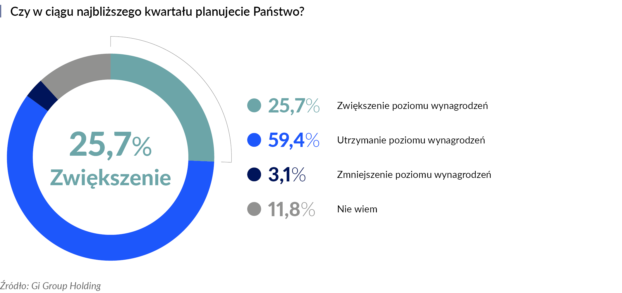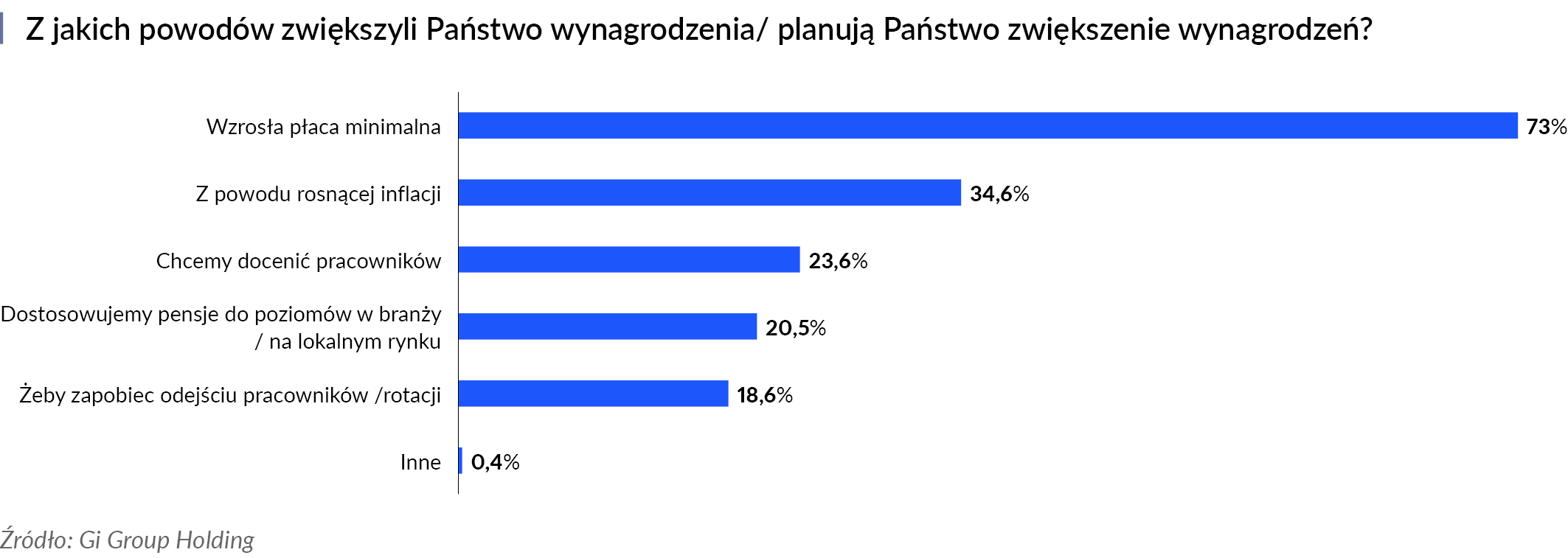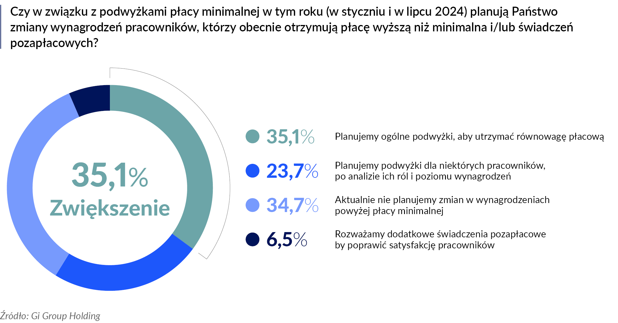 SW Research na zlecenie Gi Group Holding zapytało pracodawców również o to, czy w związku z dwiema podwyżkami płacy minimalnej w tym roku planują zmiany wynagrodzeń pracowników, którzy obecnie otrzymują płacę wyższą niż pensja minimalna. Odpowiedzi kształtują się następująco: 35% badanych firm planuje ogólne podwyżki, aby utrzymać równowagę płacową, 24% przewiduje wzrost dla niektórych pracowników, po analizie ich ról i poziomu wynagrodzeń, 6,5% rozważa natomiast dodatkowe świadczenia pozapłacowe, by poprawić satysfakcję zatrudnionych.