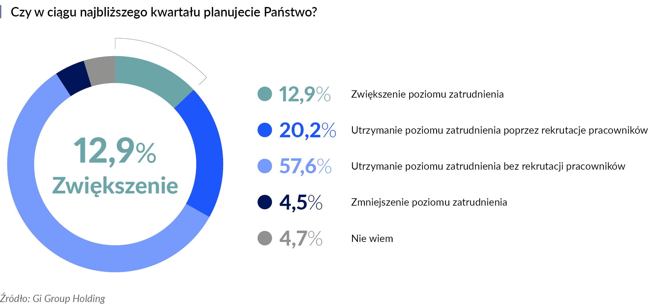 Ubiegły rok był w wielu branżach okresem optymalizacji kosztów i procesów, również w obszarze rekrutacji. Z badania przeprowadzonego przez Gi Group Holding wynika, że firmy wciąż ostrożnie podejmują decyzje biznesowe. Tylko co ósmy (13%) pracodawca deklaruje plany zwiększenia zatrudnienia w ciągu najbliższego kwartału. Utrzymanie dotychczasowej liczby pracowników prognozuje łącznie 78% pracodawców – 58% ma nadzieję na dokonanie tego bez rekrutacji nowych pracowników, a 20% dopuszcza konieczność zatrudnienia nowych osób. Zmniejszenie liczebności zespołów planuje natomiast 5% przedsiębiorców.
