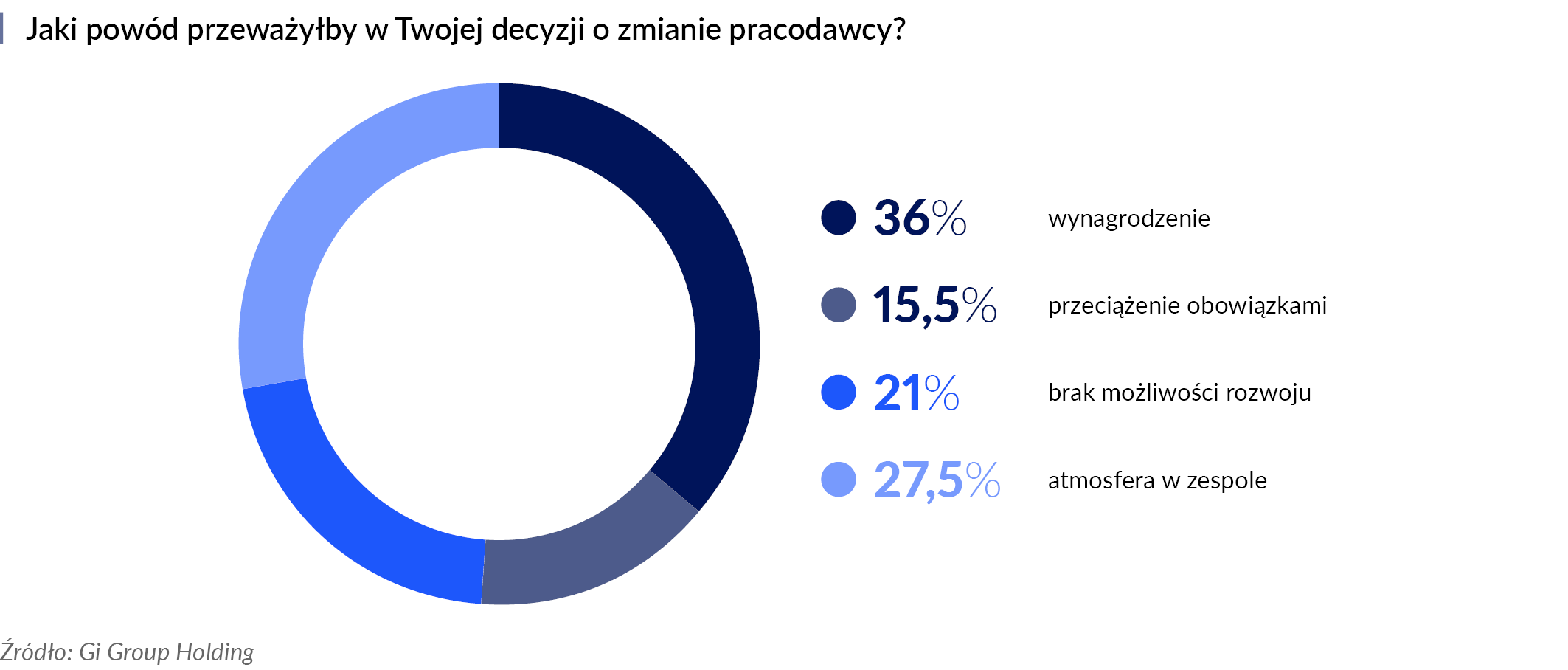 Kiedy zapytamy pracowników o przyczyny zmiany pracy, odpowiedzi układają się w interesującą gradację. Zgodnie z przewidywaniami, według 36% respondentów najistotniejszym czynnikiem okazuje się wynagrodzenie. Uwagę zwraca jednak wysoki odsetek osób, dla których priorytetem jest atmosfera w zespole. Wskazało na nią 27,5% osób, co podkreśla znaczenie zdrowego środowiska pracy i dobrych relacji międzyludzkich.