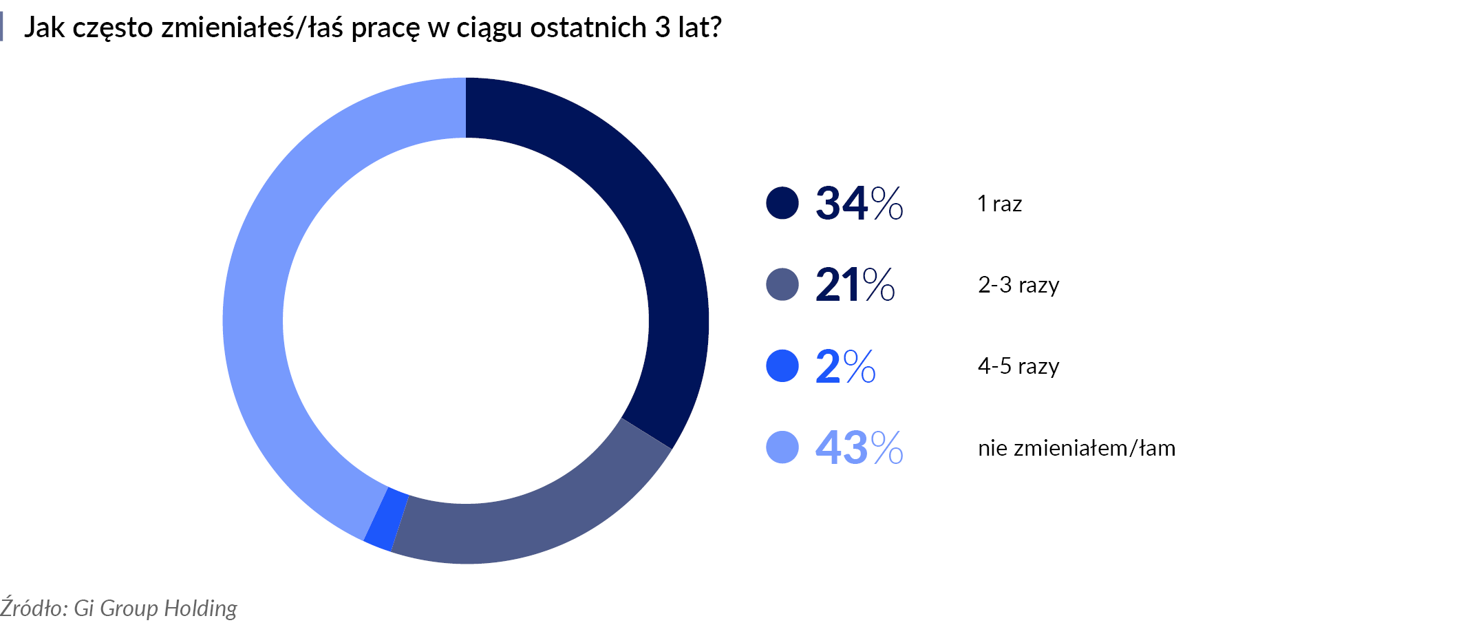 Potwierdza to kolejna liczba – z ankiety wynika, że zaledwie 2% respondentów zdecydowała się na zmianę pracodawcy cztery lub pięć razy na przestrzeni 3 lat, co może wskazywać na tzw. skoczka albo też… freelancera korzystającego z tzw. gig economy (zatrudniania pracowników do konkretnego projektu).