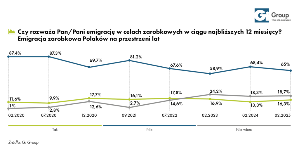 Tymczasem zainteresowanie emigracją zarobkową pozostaje wysokie. W badaniu przeprowadzonym przez SW Research w lutym br. na zlecenie Gi Group („Migracje zarobkowe Polaków”) 16,3% respondentów przyznało, że rozważa wyjazd z Polski w celach zarobkowych w ciągu najbliższego roku. Jednocześnie 65% nie planowało podjęcia takich kroków, a 18,7% nie miało opinii na ten temat. Takie wyniki oznaczają powrót do utrzymującego się od lat trendu, po ubiegłorocznym spadku odsetka zainteresowanych wyjazdem do 13,3%. Nadal do emigracji zarobkowej skłonni są bardziej mężczyźni (19%) niż kobiety (13,8%), głównie osoby w wieku 18–24 lata (24%). W tej grupie są częściej osoby z wykształceniem podstawowym (23%) i średnim (19%), rzadziej z wyższym (11%).